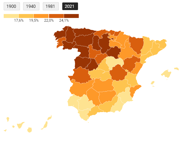 Tal y como refleja el siguiente mapa, las provincias más envejecidas en la actualidad se encuentran en el Noroeste peninsular que componen Galicia, Asturias y Castilla y León. Esta situación no fue siempre la misma en los últimos 121 años. En 1981, las regiones limítrofes con la Comunidad de Madrid eran las zonas donde vivía un mayor número de población mayor. En 1940, tras acabar la Guerra Civil, provincias catalanas y aragonesas, además de Castellón y Baleares, tenían más gente mayor que la media nacional. Y en 1900, nuevamente el Noroeste peninsular, junto a zonas del País Vasco, Aragón y las dos Castillas, aparecían como los territorios más envejecidos, aunque con porcentajes mucho más bajos y próximos a la media nacional que los registrados en 2021.