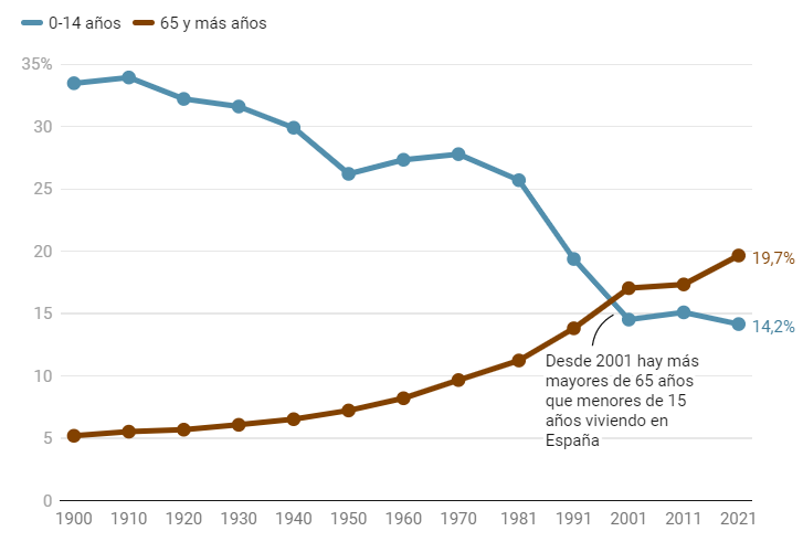 La proporción que representan las personas de 65 y más años sobre el conjunto de la población se ha cuadruplicado en estos 121 años, al pasar del 5% en 1900 a rozar el 20% en 2021. En cambio, mientras a principios del siglo XX una cada tres personas censadas (más del 33% del total) tenía menos de 15 años, ahora sólo son una de cada siete (14,2%).