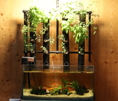 Imagen. Los sistemas de acuaponía resultan de la unión entre acuicultura (piscifactoría) e hidroponía (cultivo en ausencia de suelo). Este sistema está basado en un diseño sostenible, ya que recircula y reutiliza sus propios productos de desecho. Las granjas de acuaponía existen a diferentes escalas, desde pequeña escala a nivel doméstico, como se muestra en la imagen, hasta granjas comerciales de gran tamaño. Fuente: GreenInBlue (www.greeninblue.es/)