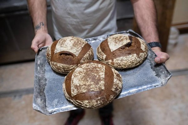 Tres panes de Masa Mater elaborador por Jesús Machí en su obrador. Foto: Kike Taberner (https://valenciaplaza.com/zoom-microbios-masa-madre).)