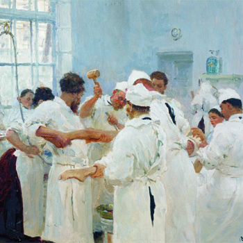 Estómago suturado. Piel suturada. "¡Vendaje! Señores".