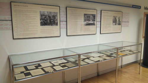 Cartel anunciador, primer panel y primera vitrina con documentos