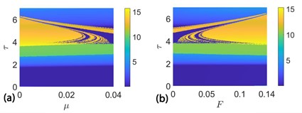 Como modelo de estudio, los investigadores de la URJC eligieron un oscilador no lineal clásico con amortiguamiento, el oscilador de Duffing, que posee un potencial de doble pozo, biestable y con una región de parámetros para los cuales el movimiento es caótico. Lo primero que se notó fue lo que se ve en la figura (a). “Es interesante analizar las cuencas de amplitud en función del término de retardo t frente al amortiguamiento m. Este tipo de graficas nos permiten, gracias a un mapa de colores, conocer el valor de la amplitud de las oscilaciones conocidos un par de parámetros del sistema. De este modo, en la figura (a) vemos que cuánto más crezca el parámetro m, más se mezclan estas cuencas entre ellas adquiriendo un carácter fractal, y aumentando, por ende, la impredecibilidad del sistema”, explica Miguel A.F. Sanjuán.