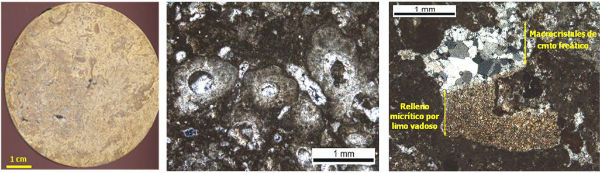 Muestra de mano de la caliza de Morata de Tajuña (izda). Imágenes de Microscopía Óptica de Polarización (nícoles cruzados) de esta caliza, observándose los moldes de algas en gran parte cementados (centro) y los diferentes cementos resultantes durante la diagénesis (dcha.)
