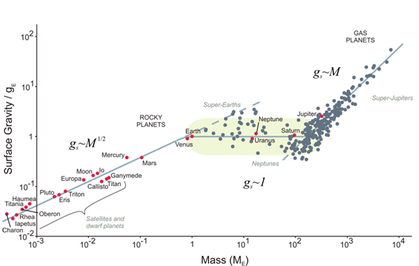 Representación doblemente logarítmica de la gravedad superficial frente a la masa (en unidades de la gravedad y la masa terrestres, gE y ME) para varios cuerpos del sistema solar (puntos rojos) y numerosos exoplanetas (puntos azules). Obsérvese el inesperado plateau que presentan los planetas con masas comprendidas entre 1 y 100 masas terrestres.