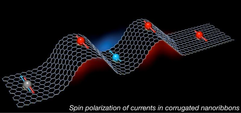 Imagen esquemática de una nanocinta de grafeno corrugada. Se ilustra por las esferas como la corriente no polarizada en espín (esfera gris) al atravesar las ondulaciones se convierte en corriente polarizada en espín (esferas de color rojo y azul). El espín se simboliza por flechas con diferentes orientaciones.