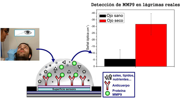 A la hora de analizar lágrimas de pacientes con ojo seco el obstáculo principal es el volumen tan reducido de muestra que se puede obtener, ya que este no suele alcanzar más de los cinco microlitros, lo que hace difícil su manipulación y examen. Los investigadores han conseguido solucionar este problema gracias a la fabricación de una superficie sensora en la que inmovilizan unos bioreceptores (anticuerpos) afines a las proteínas objetivo y que puede albergar muestras de incluso un microlitro sin que estas se evaporen. Además, en el caso del análisis de las lágrimas aparecen otras complicaciones ya que contienen proteínas, sales, grasas y otros componentes que pueden interferir en el diagnóstico. Sin embargo, esto también ha sido resuelto con la elección de anticuerpos realizada, y se ha logrado la detección única de la proteína relacionada con el DED, la Matrix metallopsidase 9, lo que demuestra el correcto funcionamiento del dispositivo.