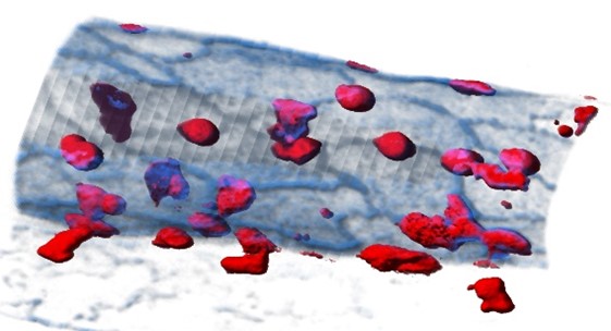 Imagen: Ejemplo de neutrófilos (rojos) dentro de un capilar sanguíneo (azul) capturados por microscopía intravital.