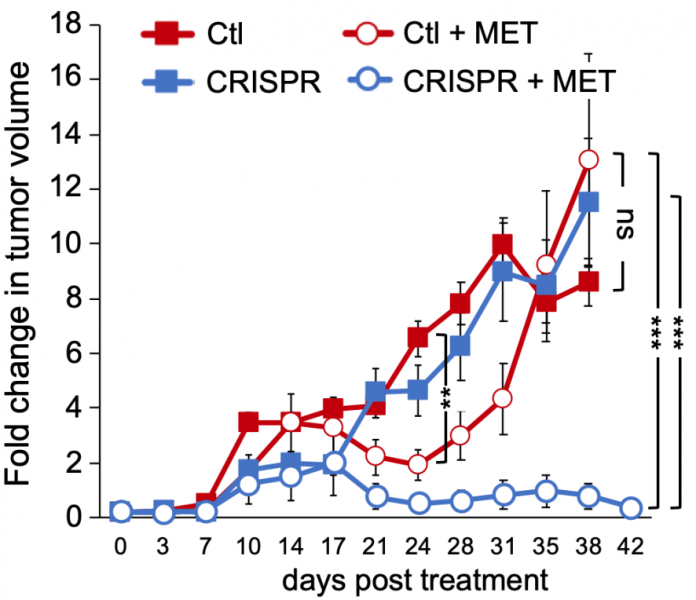 Promedio de cambio de volumen tumoral en xenoinjertos controles o en xenoinjertos sin ISG15 (CRISPR) con o sin tratamiento con metformina (MET) en el transcurso de 42 días. Se aprecia que los tumores deficientes en ISG15 son altamente susceptibles a la metformina.