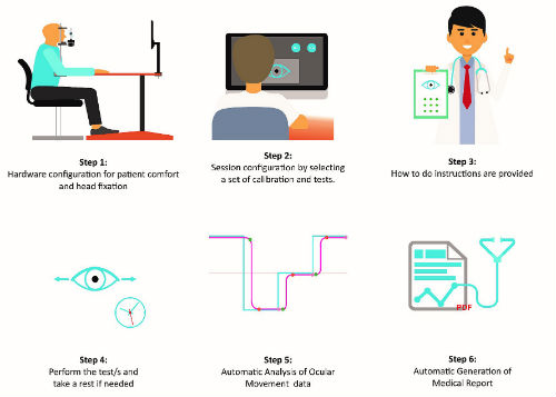 La prueba se realiza en la consulta, sin necesidad de volver a citar al paciente, y es sencilla y rápida de realizar (vídeo). El personal que realiza la prueba selecciona la batería de test oculares que realizará al paciente. El paciente se sienta cómodamente en una silla y se adapta el dispositivo a su anatomía para poder medir con precisión el movimiento ocular. Cada test dura un minuto durante el cual el paciente debe mirar el estímulo que aparece en el monitor frente a él. Una vez acabada la prueba, el asistente robótico procesa las imágenes obtenidas, analiza los resultados y los compara con los modelos patológicos que se han desarrollado en los ensayos clínicos para, finalmente, generar el informe médico.