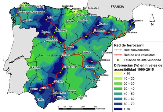 However, there are some areas where the changes in accessibility levels are low such as Extremadura, Galicia, and País Vasco. It is expected an improvement of these areas in the near future improving the territorial cohesion thanks to the ongoing construction of new AVE rails.