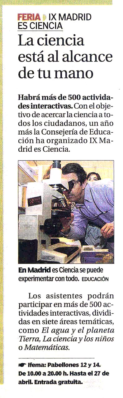 Habrá más de 500 actividades interactivas. Con el objetivo de acercar la ciencia a todos los ciudadanos, un año más la Consejería de Educación ha organizado IX Madrid es Ciencia.