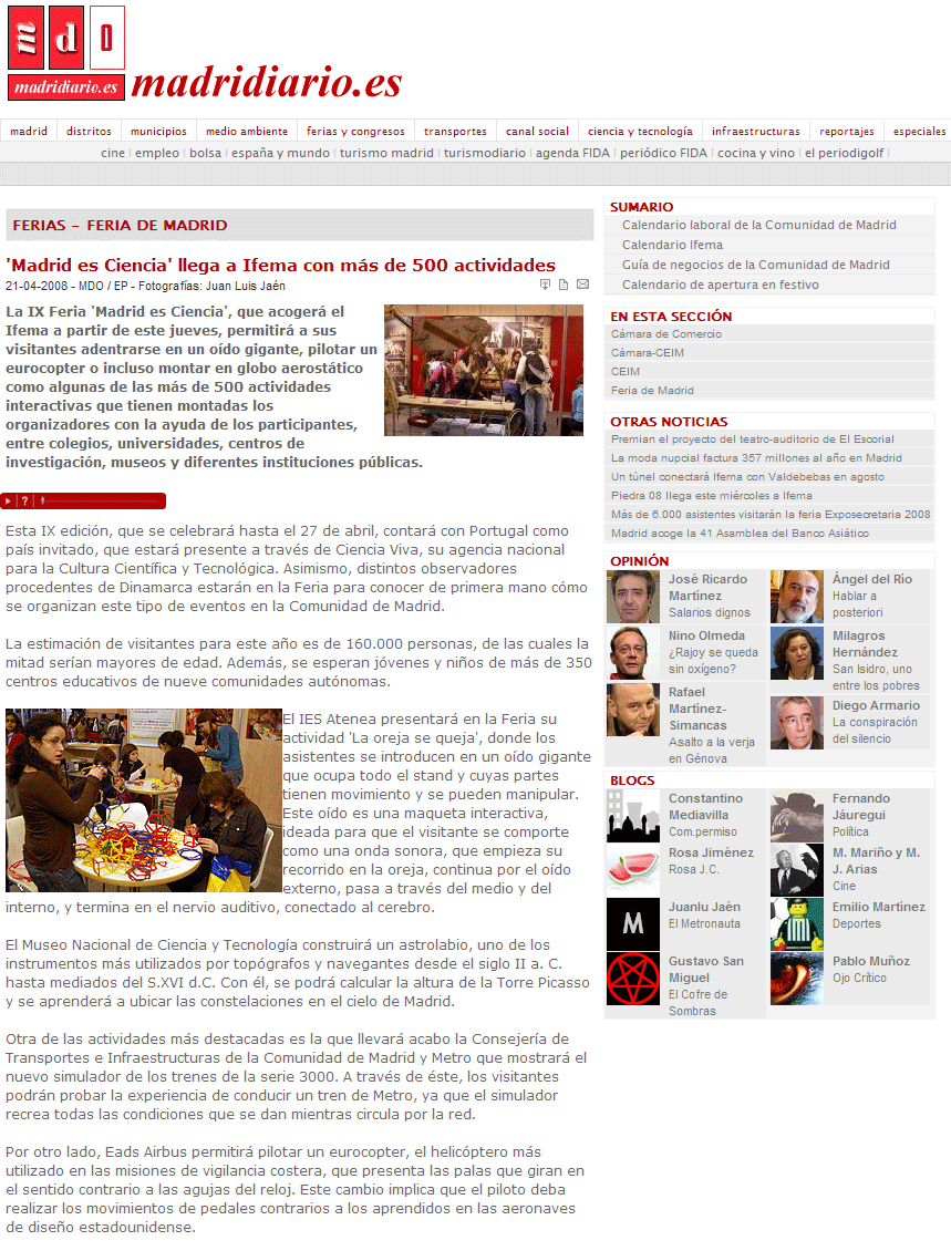 La IX Feria 'Madrid es Ciencia', que acogerá el Ifema a partir de este jueves, permitirá a sus visitantes adentrarse en un oído gigante, pilotar un eurocopter o incluso montar en globo aerostático como algunas de las más de 500 actividades interactivas que tienen montadas los organizadores con la ayuda de los participantes, entre colegios, universidades, centros de investigación, museos y diferentes instituciones públicas.