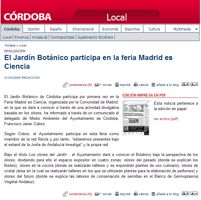 El Jardín Botánico de Córdoba participa por primera vez en la Feria Madrid es Ciencia, organizada por la Comunidad de Madrid, en la que se dará a conocer a través de una actividad divulgativa basada en los olores, ha informado a través de un comunicado el delegado de Medio Ambiente del Ayuntamiento de Córdoba, Francisco Javier Cobos.