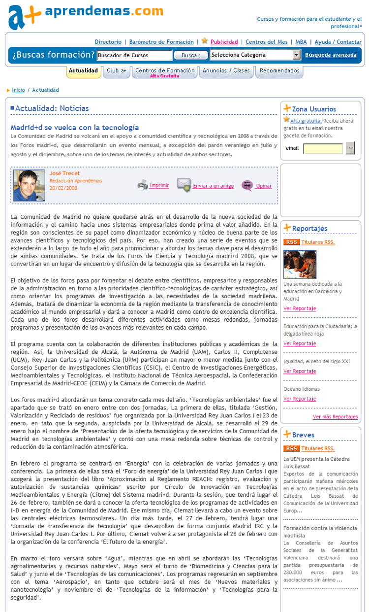 La Comunidad de Madrid se volcará en el apoyo a comunidad científica y tecnológica en 2008 a través de los Foros madri+d, que desarrollarán un evento mensual, a excepción del parón veraniego en julio y agosto y el diciembre, sobre uno de los temas de interés y actualidad de ambos sectores.