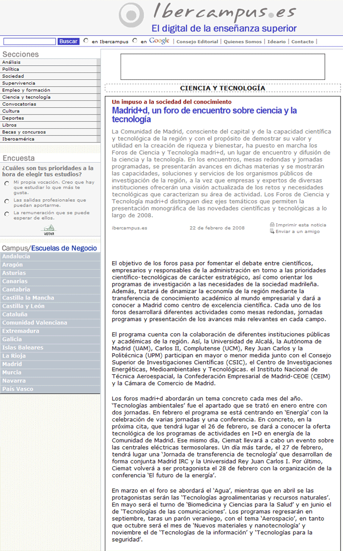 La Comunidad de Madrid, consciente del capital y de la capacidad científica y tecnológica de la región y con el propósito de demostrar su valor y utilidad en la creación de riqueza y bienestar, ha puesto en marcha los Foros de Ciencia y Tecnología madri+d, un lugar de encuentro y difusión de la ciencia y la tecnología. En los encuentros, mesas redondas y jornadas programadas, se presentarán avances en dichas materias y se mostrarán las capacidades, soluciones y servicios de los organismos públicos de investigación de la región, a la vez que empresas y expertos de diversas instituciones ofrecerán una visión actualizada de los retos y necesidades tecnológicas que caracterizan su área de actividad. Los Foros de Ciencia y Tecnología madri+d distinguen diez ejes temáticos que permiten la presentación monográfica de las novedades científicas y tecnológicas a lo largo de 2008.