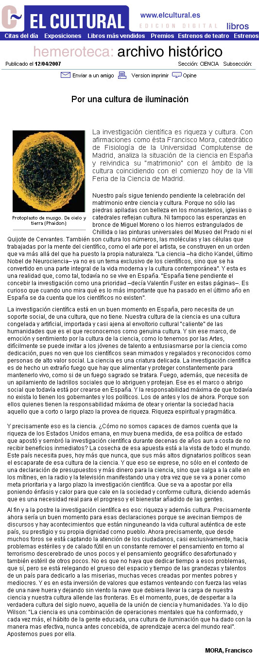 La investigación científica es riqueza y cultura. Con afirmaciones como ésta Francisco Mora, catedrático de Fisiología de la Universidad Complutense de Madrid, analiza la situación de la ciencia en España y reivindica su matrimonio con el ámbito de la cultura coincidiendo con el comienzo hoy de la VIII Feria de la Ciencia de Madrid.