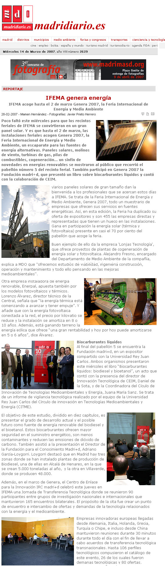 IFEMA acoge hasta el 2 de marzo Genera 2007, la Feria Internacional de Energía y Medio Ambiente, un escaparate para las fuentes de energía alternativas. La Fundación madri+d participa con la presentación de de un libro sobre biocarburantes líquidos.