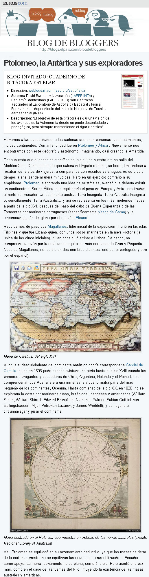 Volvemos a las casualidades, a las cadenas que unen personas, acontecimientos, incluso continentes. Con anterioridad fueron Ptolomeo y Africa. Nuevamente nos encontramos con este geógrafo y astrónomo, imaginado, casi creando la Antártida