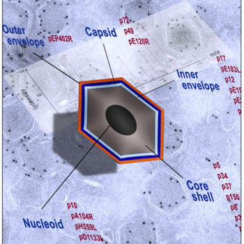 Representación de la arquitectura molecular del virus de la peste porcina africana y de las técnicas empleadas para su estudio (espectrometría de masas e inmunomicroscopía electrónica). /Journal of Virology