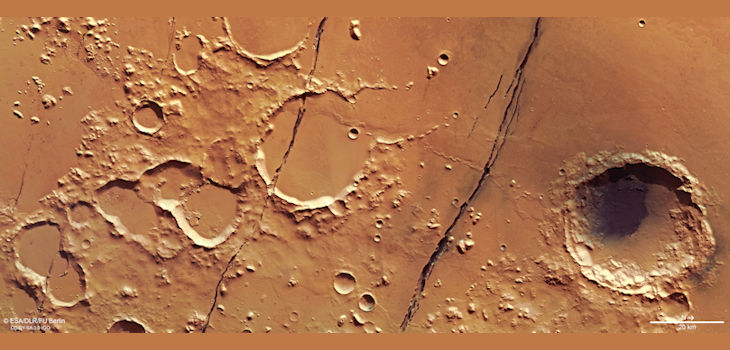 Estas llamativas fisuras se deben a la acción de fallas que resquebrajaron la superficie del planeta hace menos de diez millones de años.
