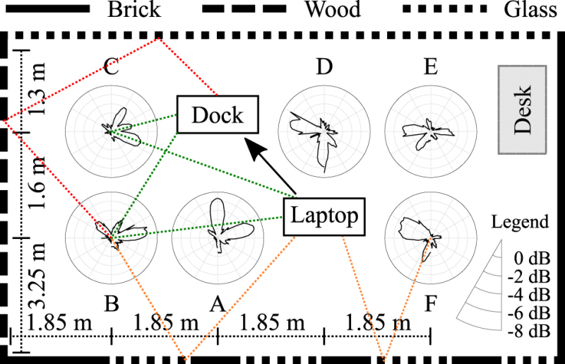Illustration 1. Analysis of the impact of reflections patterns in a realistic mm-wave wireless setting (conference room). The dotted lines show examples of Line of Sight paths as well as first and second order reflections. The results of TIGRE5-CM highlight that these second order reflections can still be strong, hence MAC layer designs should take advantage from those to improve system performance.