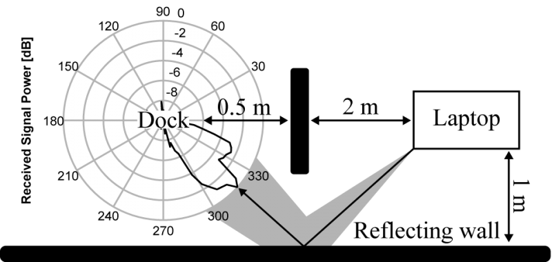 Illustration 2. Data transmission over a mm-wave channel exclusively via a reflected path. Please note that the angular energy profile does not include any lobe on the Line of Sight path