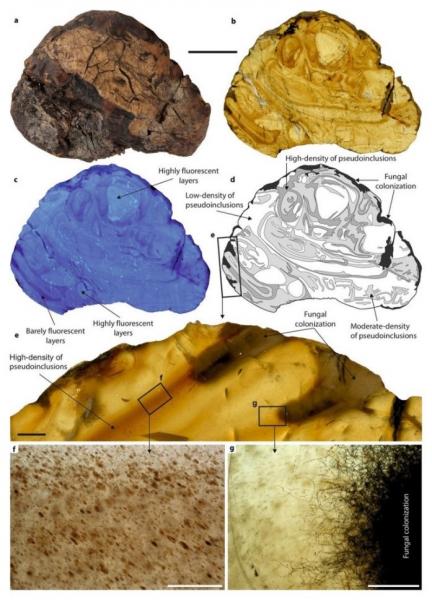Patrones de bandeado en las piezas de ámbar de El Soplao. a) Aspecto de la superficie. b) Sección pulimentada. c) Imagen de luz ultravioletra. d) Detalle de las piezas. e) Ampliación con restos fúngicos. f) Detalle con pseudoinclusiones. g) Frente de avance de la colonización fúngica / Scientific Reports