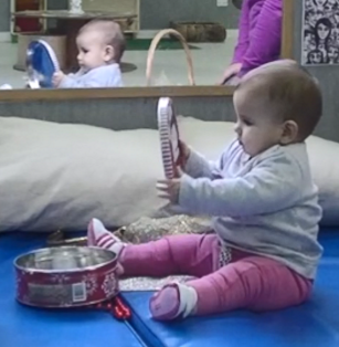 Una niña de 9 meses detiene por completo su actividad y se presenta a sí misma la tapa de una lata para contemplarla, rotándola por ambos lados (gesto ostensivo autodirigido) / UAM