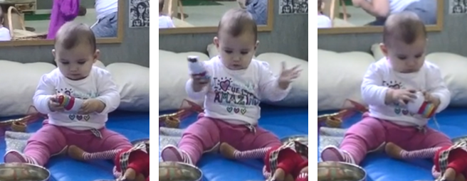 Una niña de 9 meses repetidamente detiene por completo su acción y se presenta a sí misma un sonajero (gesto ostensivo autodirigido), alternando momentos de uso y contemplación / UAM