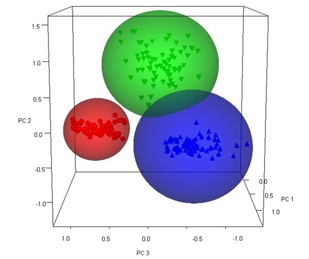 Las esferas rojas representan las muestras de corcho puro, los conos azules las muestras de mancha amarilla y los conos invertidos verdes las muestras de leño. Fuente: Elaboración propia mediante el programa IDENT de Bruker.
