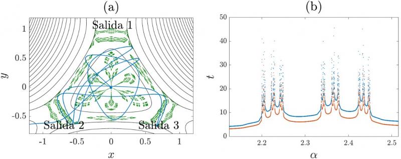 Los investigadores han explorado este tipo de caos en el sistema de Hénon-Heiles, que constituye un sistema paradigmático en Dinámica No Lineal. “Modelizamos el movimiento de un cuerpo que interacciona con un pozo de potencial abierto del que puede escapar por una de sus salidas. Hasta que tiene lugar el escape, la trayectoria del cuerpo es típicamente enmarañada, gracias a la presencia de una conjunto fractal que gobierna la dinámica, llamada silla caótica, como se muestra en la figura 1(a)”, afirma Diego Fernández.