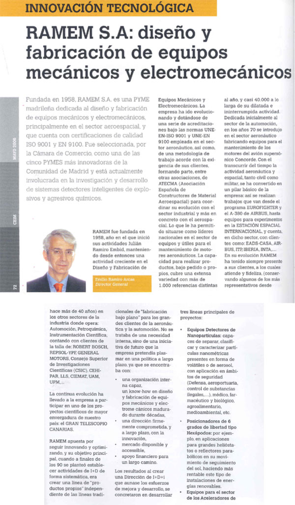 Fundada en 1958, RAMEM.S.A es una pyme madrileña dedicada al diseño y fabricación de equipos mecánicos y electromecánicos, principalmente en el sector aeroespacial, y que cuenta con certificaciones de calidad ISO 9001 y en ISO 9100. Fue seleccionada. Por la Cámara de Comercio, como una de las cinco PYMES más innovadoras de la Comunidad de Madrid y está actualmente involucrada en la investigación y desarrollo de sistemas detectores inteligentes de explosivos y agresivos químicos.