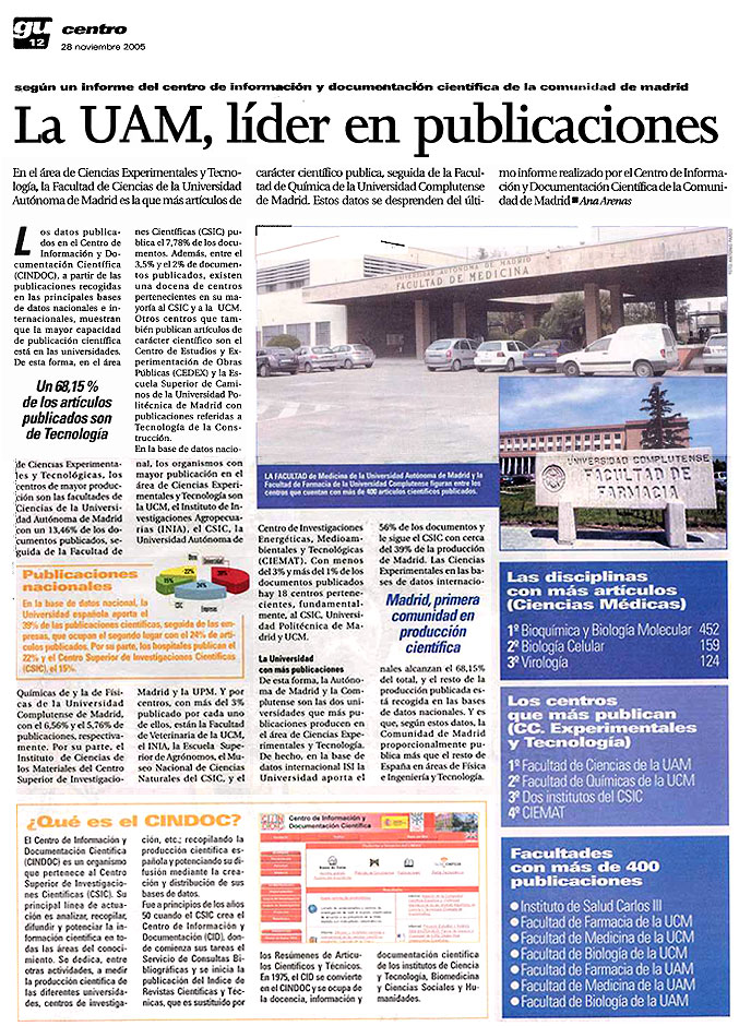 En el área de Ciencias Experimentales y Tecnología, la Facultad de Ciencias de la Universidad Autónoma de Madrid es la que más artículos de carácter científico publica, seguida de la Facultad de Química de la Universidad Complutense de Madrid. Estos datos se desprenden del último informe realizado por el Centro de Información y Documentación Científica de la Comunidad de Madrid.