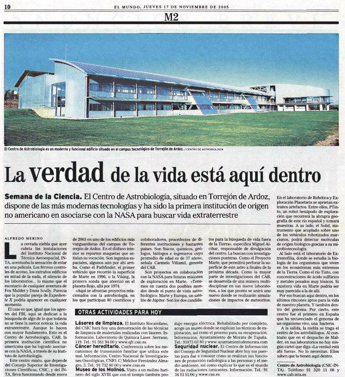 Semana de la ciencia. El centro de Astrobiología, situado en Torrejón de Ardoz, dispone de las más modernas tecnologías y ha sido la primera institución de origen no americano en asociarse con la NASA para buscar vida extraterrestre.
