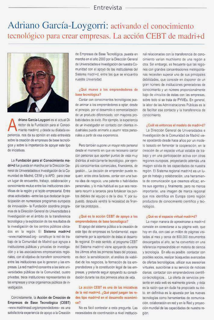 La revista Encanto Blanco en su edición nº 29 publica una entrevista a D. Adriano García-Loygorri, actual Director de la Fundación para el Conocimiento madri+d