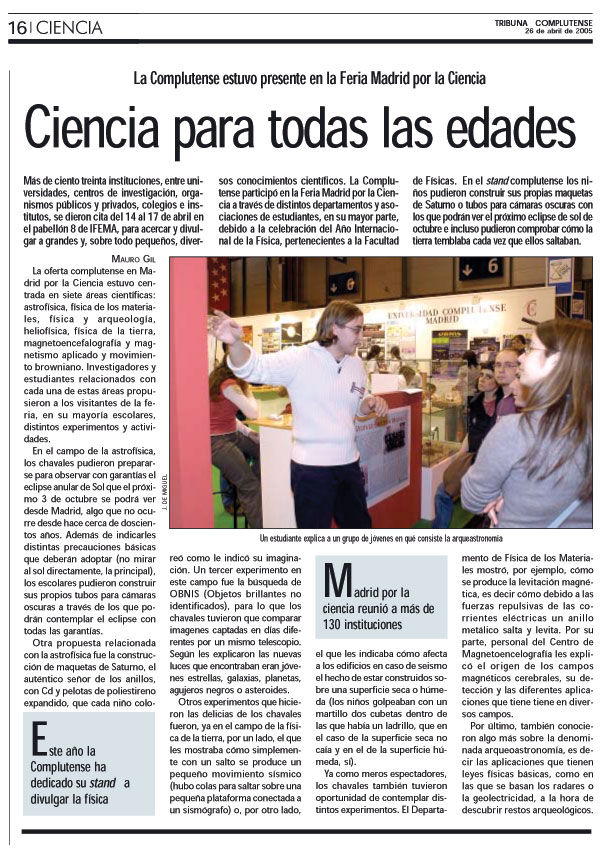 La Complutense estuvo presente en la Feria Madrid por la Ciencia. Más de ciento treinta instituciones, entre universidades, centros de investigación, organismos públicos y privados, colegios e institutos, se dieron cita del 14 al 17 de abril en el pabellón 8 de IFEMA, para acercar y divulgar a grandes y, sobre todo pequeños, diversos conocimientos científicos.
