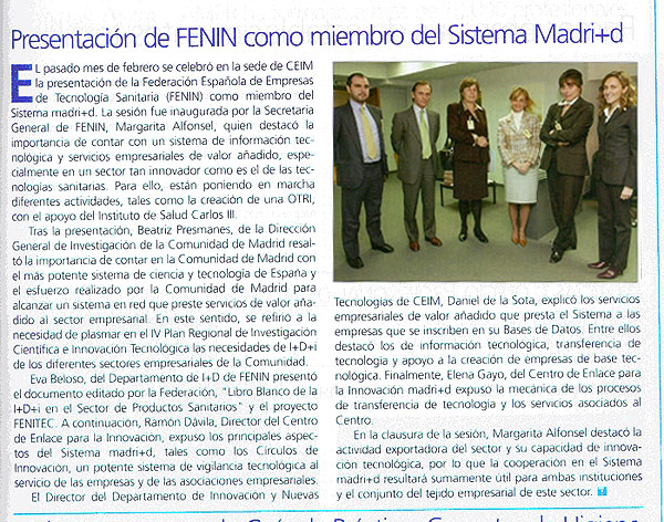 El pasado mes de febrero se celebró en la sede de CEIM la presentación de la Federación Española de Empresas de Tecnología Sanitaria (FENIN) como miembro del Sistema madri+d.
