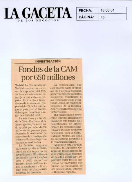 La Comunidad de Madrid convoca ayudas por valor de 650 millones de pesetas (3,9 millones de euros) para fomentar la realización de proyectos I+D en las pymes madrileñas.