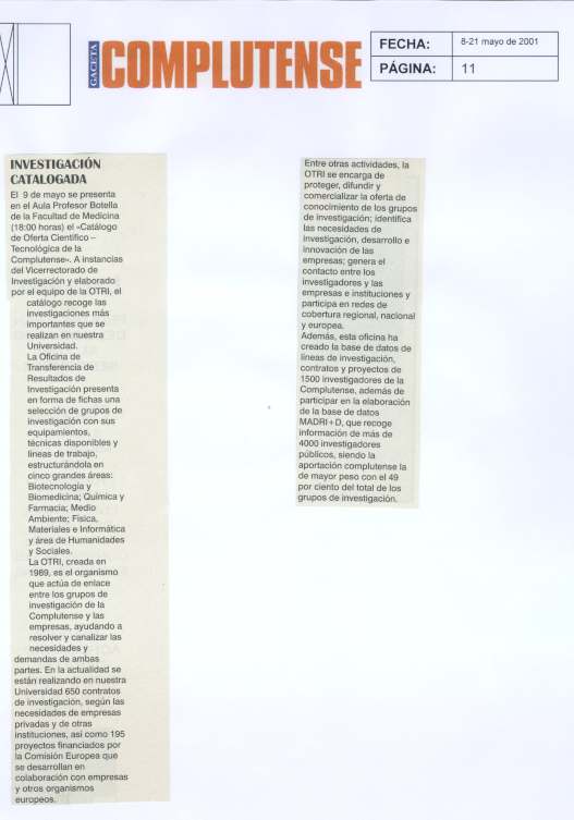 El 9 de Mayo se presenta en el Aula Profesor Botella de la Facultad de Medicina (18:00 horas) el Catálogo de oferta Científico-Tecnológica de la Complutense.