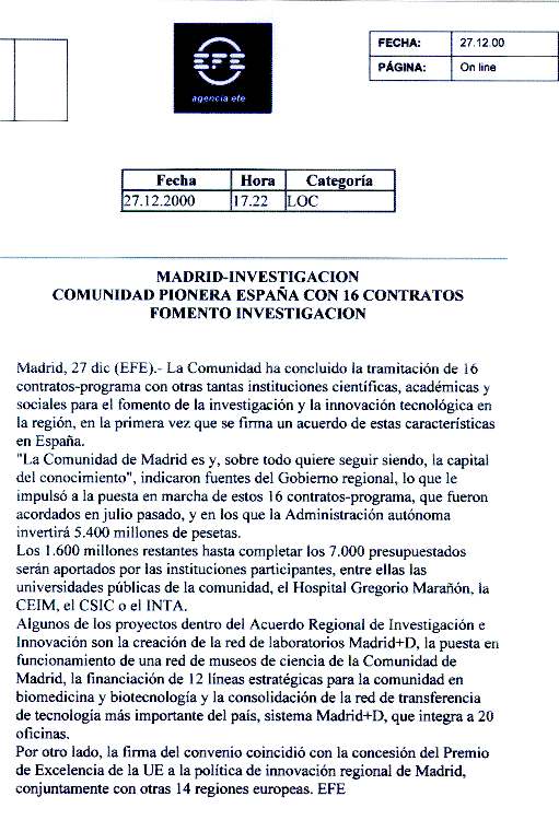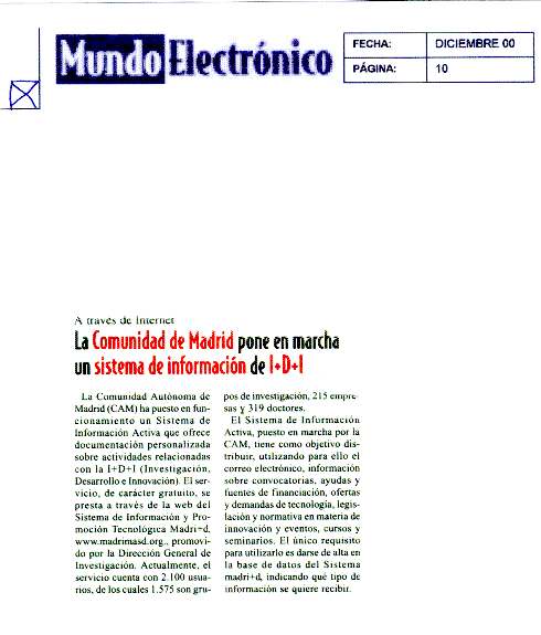 La Comunidad Autónoma de Madrid (CAM) ha puesto en funcionamiento un Sistema de Información Activa que ofrece documentación personalizada sobre actividades elacionadas con I+D+I (Investigación, Desarrollo e Innovación).