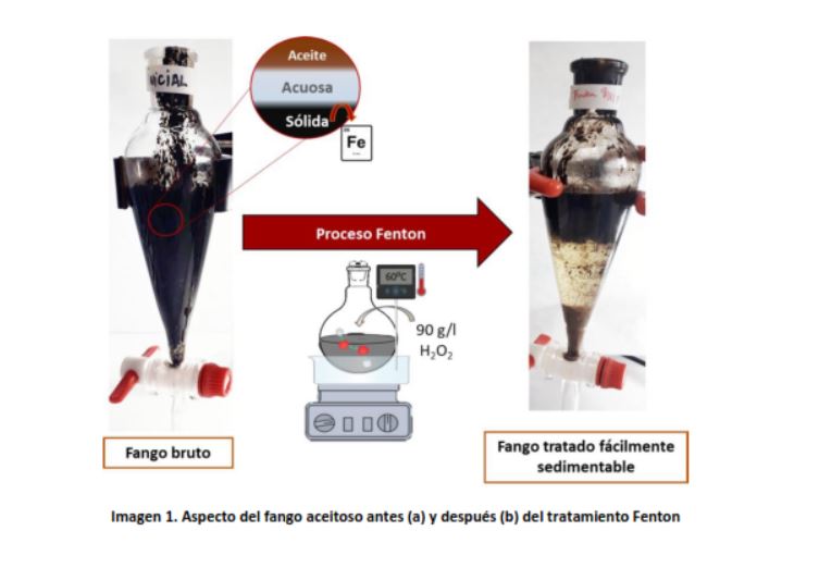 Se ha observado también cómo la apariencia física del fango cambió antes y después del tratamiento (como se observa en la imagen 1). Al principio, la muestra del fango tenía un aspecto negro y viscoso, similar al crudo de petróleo, y después del tratamiento de oxidación Fenton en las condiciones óptimas obtenidas en este estudio, las tres fases del fango (aceite/agua/sólidos) se separaron perfectamente. “Los radicales hidroxilo generados en las reacciones de oxidación Fenton inducen la descomposición del fango desestabilizando la emulsión”, explica Isabel Pariente, quien destaca que, “después del tratamiento, se podría aplicar un proceso de sedimentación convencional y evitar el elevado coste asociado a la centrifugación utilizada actualmente en refinería”.