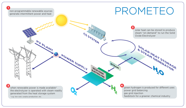 Para afrontar retos titánicos, es necesario un titán con valentía. De forma parecida al personaje mitológico Prometeo, el Titán que desafió a los dioses robando el fuego del sol y dándoselo a la humanidad, el proyecto PROMETEO pretende captar la energía solar creando el proceso más eficiente jamás visto para convertir la energía solar en el combustible sostenible del futuro: el hidrógeno verde. Para ello, el proyecto utilizará la tecnología del óxido sólido para construir un prototipo de electrolizador de 25 kWe capaz de producir 15 kg de hidrógeno al día. El prototipo del sistema será modular, con el potencial de ser reproducido a escala industrial de MWe. El prototipo combinará el calor renovable y la electricidad para realizar la electrolisis a alta temperatura de forma continua. Este es el reto principal del prototipo de PROMETEO: producir hidrógeno verde aun cuando no se disponga de energía renovable «directa» o cuando su uso sea más barato, como en los casos de excedentes de producción. Al igual que el castigo nocturno del Titán, PROMETEO requerirá un sistema innovador para gestionar las fases de producción y regeneración de energía, minimizando la retirada de electricidad de la red de distribución y optimizando la autoproducción a partir de renovables cuando la energía solar no esté disponible.