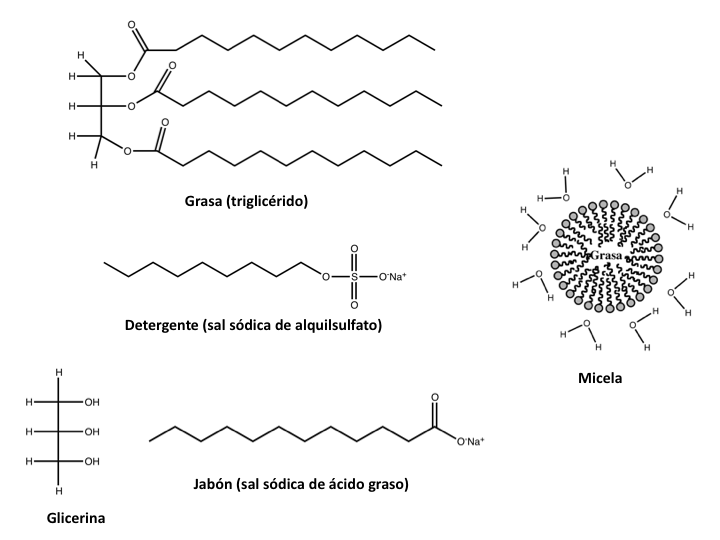 Hay que recordar que lo que limpia es el agua, pero el agua solo disuelve sustancias con cierta polaridad y lo que ensucia nuestras manos, suelos y ropa suelen ser sustancias lipídicas (grasas) insolubles en agua. Lo que hace el jabón es actuar facilitando la interacción entre el agua y la grasa. Las sustancias que provocan este efecto se denominan surfactantes o tensioactivos, que se pueden considerar términos equivalentes.