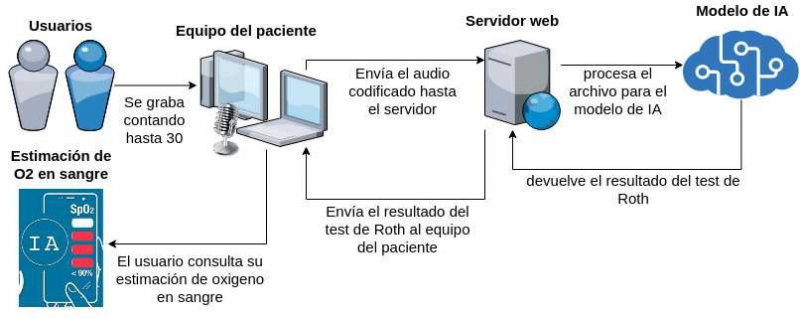El sistema emplea herramientas avanzadas de inteligencia artificial para realizar un análisis automático del audio, identificando palabras, tiempos de inicio y fin de cada una de ellas, y respiraciones. “A partir de la información obtenida, se calcula la estimación del nivel de saturación de oxígeno en sangre mediante el Test de Roth”, agregan los autores.