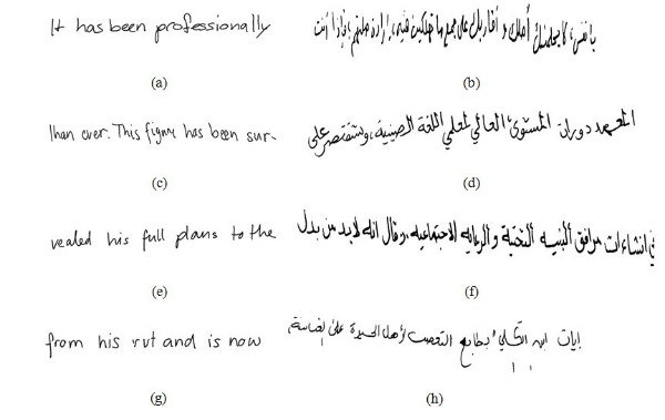 Ejemplos de textos manuscritos en la base de datos IAM (columna izquierda) y en la base de datos KHATT (columna derecha). Estos textos fueron escritos por: (a) y (b) hombre diestro, (c) y (d) hombre zurdo, (e) y (f) mujer diestra, y (g) y (h) mujer zurda, respectivamente.