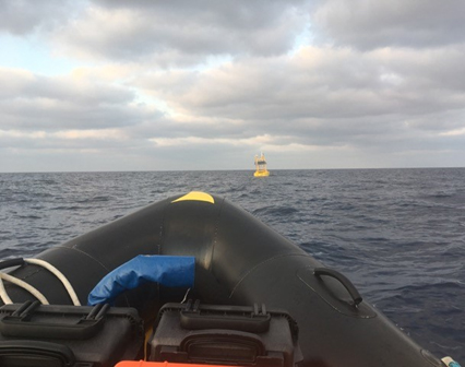 Recogida experimental de datos a través de un sistema de comunicación acústica en un bote cerca de la costa del norte de Israel. La boya en la imagen pertenece al proyecto THEMO.