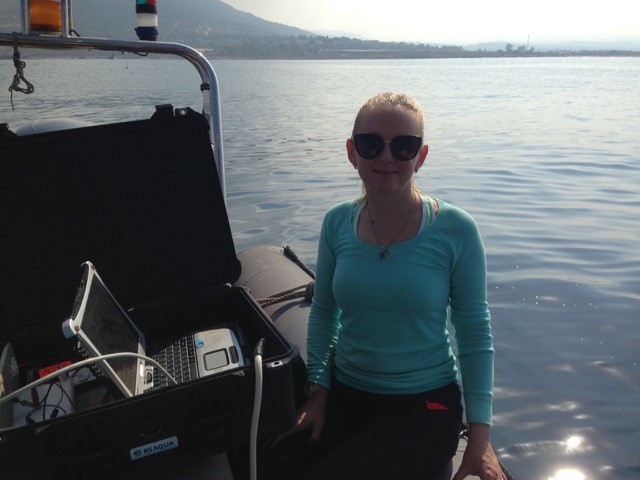Elizaveta Dubrovinskaya durante un experimento en un bote cerca de la coste del norte de Israel. Recogió datos con un sistema de comunicación acústica que emplea un ordenador 'robusto', especialmente diseñado para operar en ambientes y condiciones difíciles.