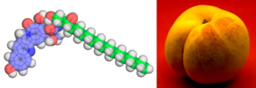 Estructura molecular del ligando de Pru p 3, alérgeno mayoritario de melocotón, formado por un alcaloide (camptotecina: carbonos en azul oscuro) unido a una cola hidrocarbonada (fitoesfingosina: carbonos en verde) Modelo y fotografía de Luis Fernández Pacios.