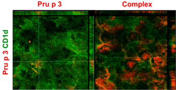 Localización del receptor celular CD1d (verde) y la proteína Pru p 3 (rojo), sin ligando (recuadro “Pru p 3”) o con ligando (recuadro “Complex”). Imagen al microscopio confocal (CBGP).